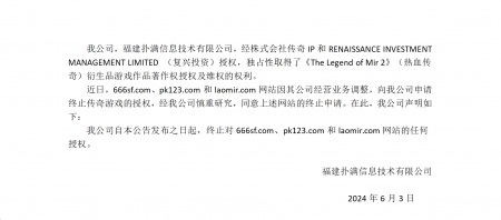 2024-06-03福建撲滿信息技術(shù)有限公司(以下簡(jiǎn)稱“我司”)經(jīng)株式會(huì)社傳奇IP、RENAISSANCEINVESTM...
